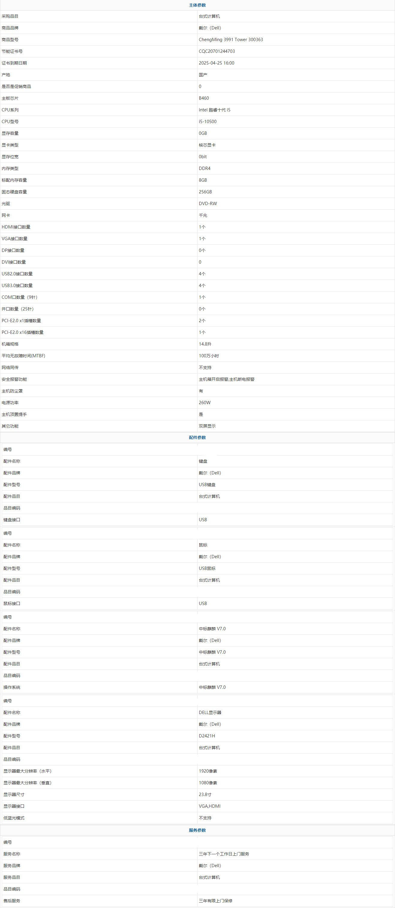 • 商品名称:戴尔(Dell) ChengMing 3991 Tower 300363 intel 酷睿十代 i5 i5-10500 8GB 256GB 中标麒麟 V7.0 23.8寸 三年有限上门保修