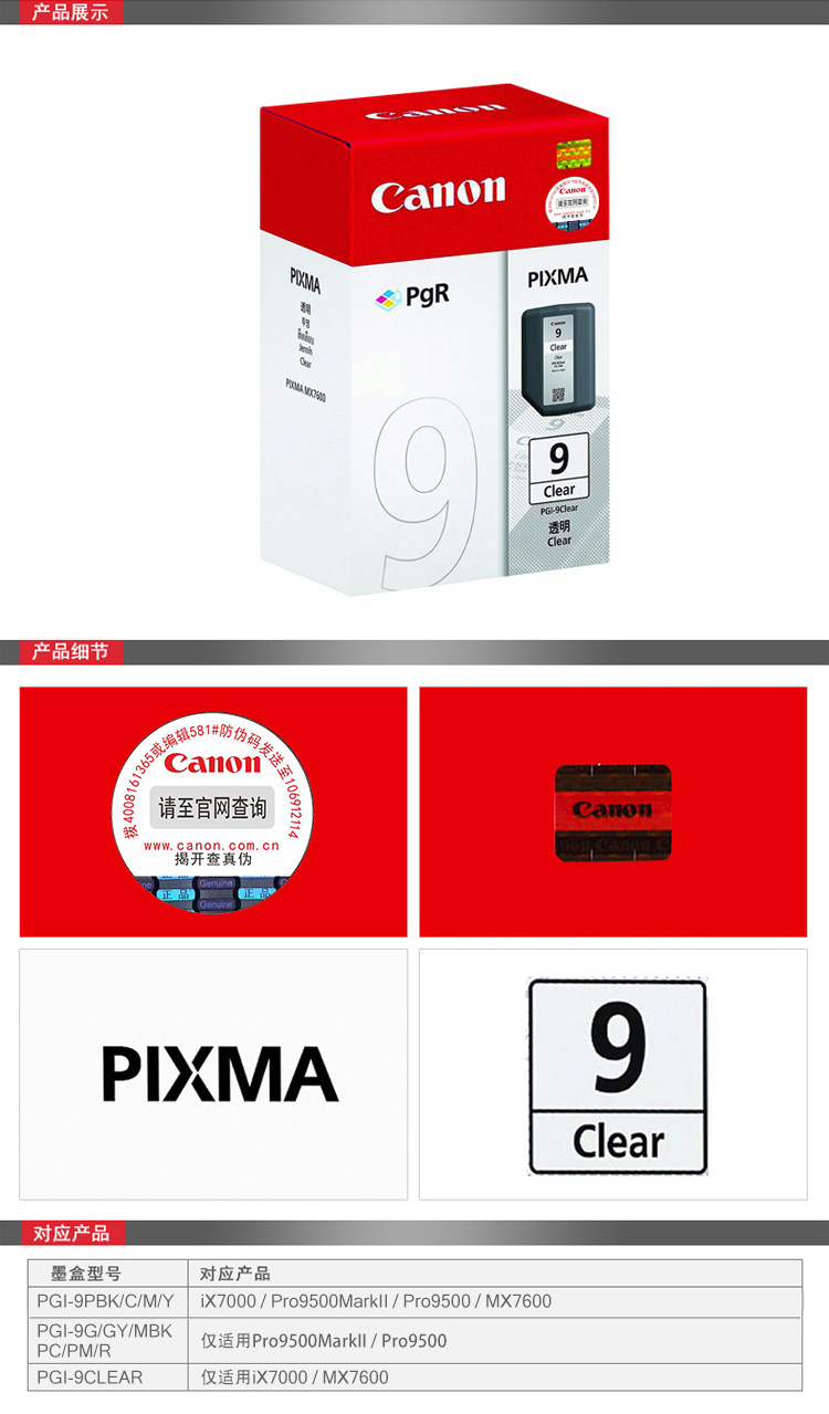 • 商品名称:佳能(Canon) PGI-9 Clear 透明色墨盒 打印量-页 适用于iX7000、MX7600